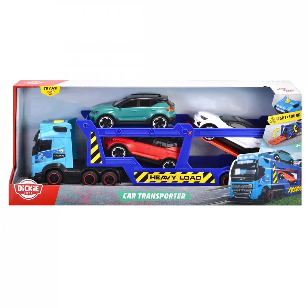 A Dickie Toys autószállító kamion tökéletes választás minden kis autórajongónak, aki szereti a nagyméretű járműveket és a szállítmányozós szerepjátékokat. Ez a valósághű Volvo kamion modern dizájnnal és izgalmas funkciókkal rendelkezik, amelyek még élvezetesebbé teszik a játékot. A készletben három különböző kisautó is található, amelyeket az alsó és a felső szintre is be lehet pakolni. A felső szint dönthető, így a gyerekek könnyedén le- és felrakodhatják a járműveket, akárcsak egy igazi autószállító tréleren! A kamion fényeffektusokkal és hangokkal is rendelkezik, így még élethűbb élményt nyújt. A strapabíró műanyagból készült kamion masszív kialakításának köszönhetően hosszú távon is kiváló játékélményt biztosít. A könnyen mozgatható kerekek lehetővé teszik a gördülékeny játékot, miközben a gyerekek fejleszthetik finommotoros készségeiket és kreativitásukat.