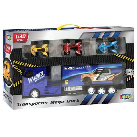 Ez a fantasztikus autószállító kamion tökéletes mása azoknak a hatalmas gépeknek, melyeket a tengerentúlon használnak, így biztosan elnyeri majd a gyerekek tetszését. A kamion oldalán egy vagány autós matrica látható és a szett 2db sportkocsit is tartalmaz, melyek beletehetőek a kamionba, hogy még szórakoztatóbb legyen majd a játék. A kamion méretaránya 1/30, ami megközelítőle3g 40cm-es hosszt jelent. A részletgazdag kidolgozásnak köszönhetően az a szett biztosan elnyeri majd a gyerekek tetszését.