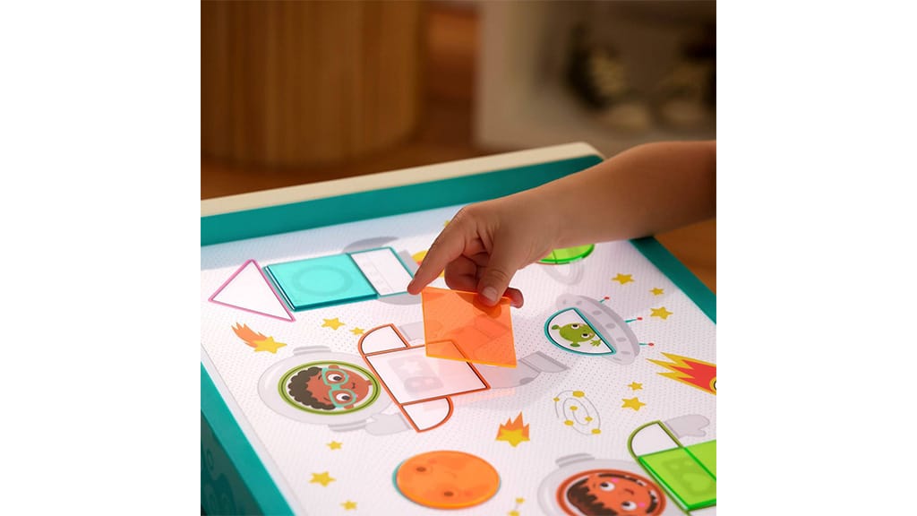 A családok ösztönözhetik a gyerekeket arra, hogy az osztálytermen kívül is tanuljanak a Look & Shine Light Box Playset segítségével. Ez a 71 darabos készlet több mint 60 tanulási kiegészítőt tartalmaz, beleértve 50 színes számot és formát, öt szárazon törölhető filctollat radírral, valamint három cserélhető átlátszó színezőlapot. Az eszköz elemmel vagy USB-C-vel működik, és öt világító színt, valamint két fényerő-beállítást kínál.