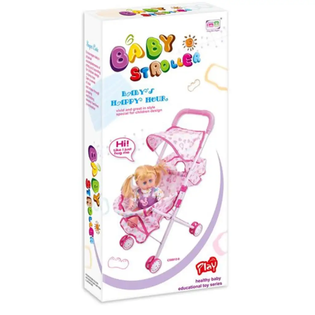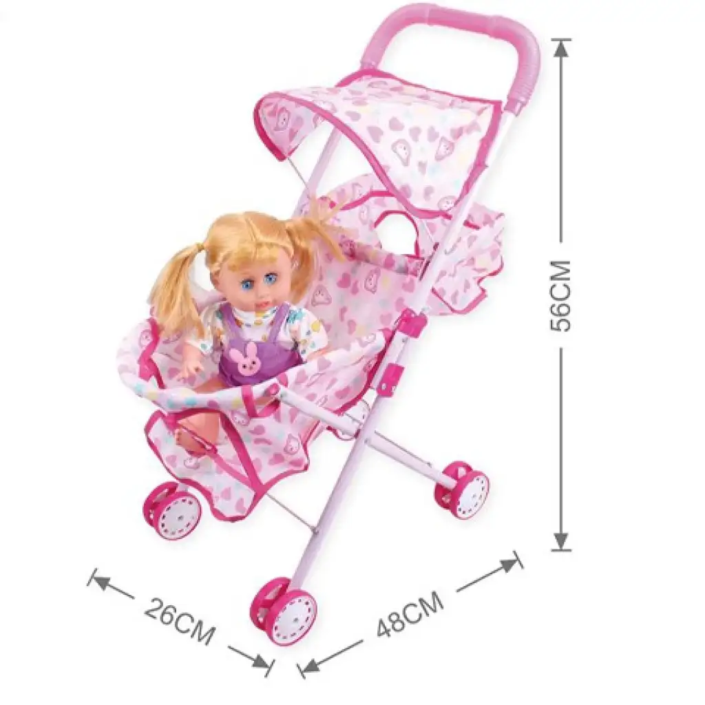 Most kislányod kipróbálhatja magát az anyukák szerepében ezzel a bájos játékszettel, hiszen a készlet nem csak a babakocsit tartalmazza hanem a hozzá illő babát is. Fejleszti gyermekedben az empátiát, hiszen a baba gondoskodást igényel, valamint a babakocsi tologatása közben a mozgás koordinációt is. A játék babát biztonságosan bele lehet ültetni a babakocsiba és akár hosszú sétára is lehet vinni. Az 56cm magasságú babakocsi fehér alapot kapott , textil elemei rózsaszín mintásak.