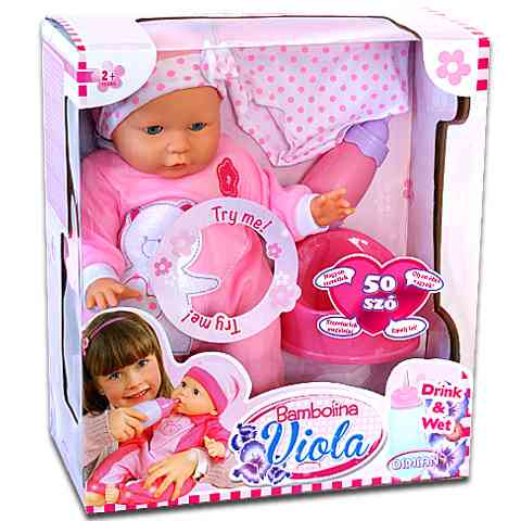 A kislányok kedvenc babája lesz Viola, aki nem csak hogy rendkívül bájos, beszédével és pisilő funkciójával is szórakoztatja a gyerekeket. Viola baba pocakját megnyomva összesen 50 különböző kifejezést mond, melyeket magyar nyelven hallgathatnak a gyerekek. A baba továbbá megitatható a cumisüvegből, majd a bilire ültetve pisiltethető. Adj rá pelenkát és vidd magaddal mindenhová!