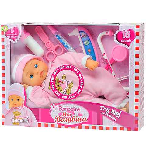 Segíts a kis Mia babának meggyógyulni! Az orvosos kiegészítők között találsz fecskendőt, hőmérőt, sztetoszkópot, cumisüveget és kis ollót is, így minden a rendelkezésedre áll majd, hogy segíts Miának meggyógyulni. A rózsaszín rugdalódzóban Mia rendkívül bájos, hasát megnyomva pedig azonnal hangokkal is jelzi, hogy épp milyen hangulatban van.