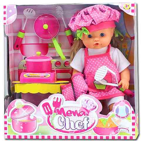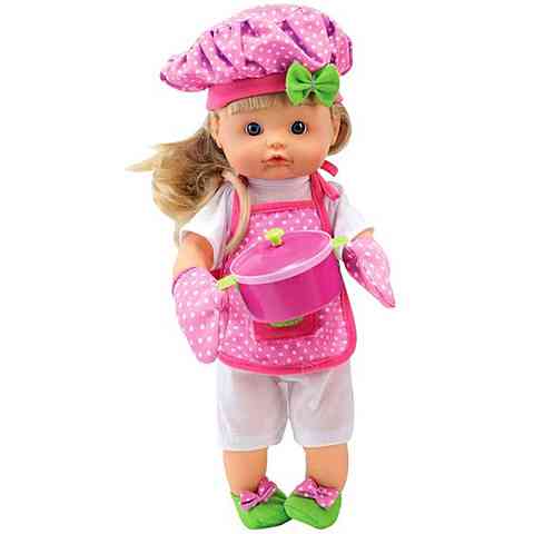 Hódítsd meg a konyhát legújabb barátoddal, a kötényt, sapkát és kesztyűt is viselő Nenával! A 42cm-es baba igazi kis társ lesz a konyhában, akivel eljátszhatják a kislányok a valódi főzés folyamatát. A kis rezsóra felhelyezheted a fazekat, melyben máris kezdődhet a finom étel elkészítése. A kislányok így remek játékélményt kapnak, melyben szüleiket utánozhatják. A baba hasának megnyomásával hangokat is hallhatsz, melyekből összesen 20 különböző mondatot hallhatsz.