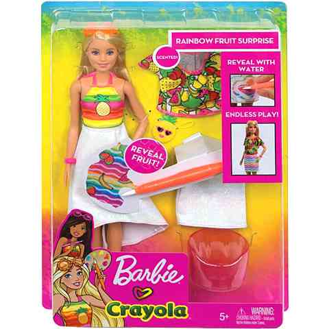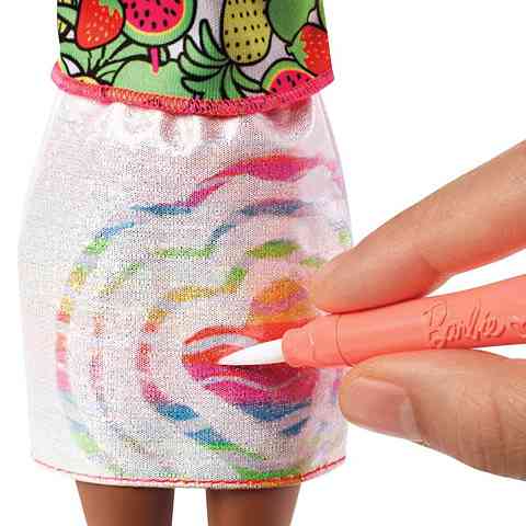 Látványos ruhákkal tehetik még érdekesebbé a kislányok a Barbie babájukat, hiszen ez a szőke baba olyan különleges Crayola szoknyákat visel, melyeknek fehér színű anyagán víz hatására azonnal megjelenik a színpompás, gyümölcsös minta. A dobozban található két szoknya is színezhető, melyhez ecset és kis vizes tál is megtalálható a szettben. A bájos baba két felsővel érkezik, melyeket szintén variálhatnak a gyerekek a babán.