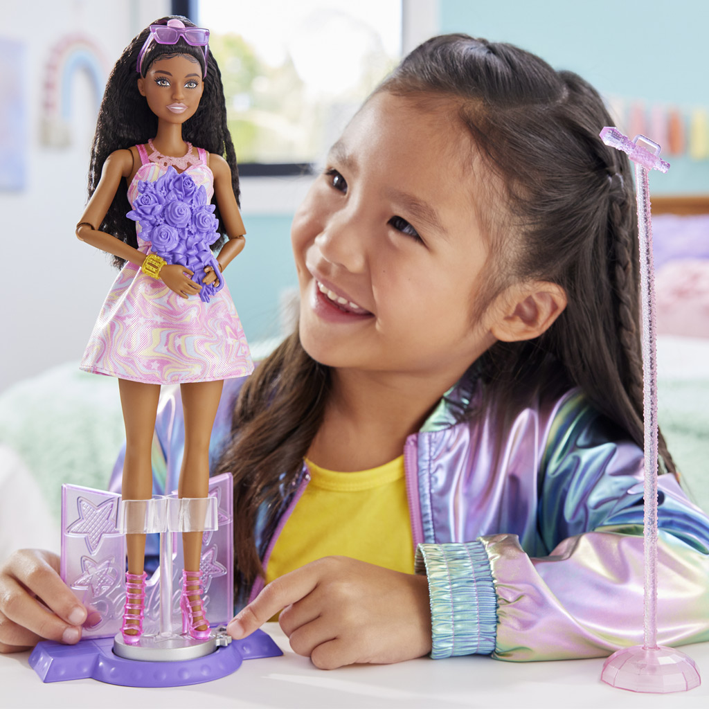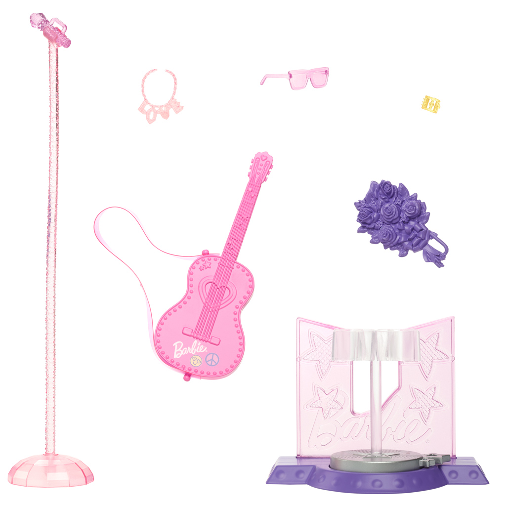 Barbie már 65 éve szórakoztat minket, és ezt az évfordulót ünnepelhetjük együtt a 65. évfordulós karrier játékszettekkel. Ebben a sorozatban űrhajós, állatorvos és popsztár babák autentikus ruhákban és munkájukhoz illő 10 tematikus kiegészítővel érkeznek. A jelen szettben egy popsztár Barbie található, aki mikrofonnal, állvánnyal (amely segítségével magától megáll a lábán), gitárral, virággal, nyaklánccal és napszemüveggel büszkélkedik.