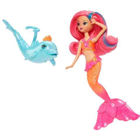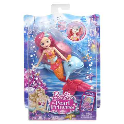 Fedezd fel a tenger mélyének varázslatos világát ezzel a csodaszép mini sellő Barbie-val! Sellő Barbie-val a Barbie és a Gyöngyhercegnő filmben találkozhattál és ismerhetted meg a kis sellők életét. Ez a rózsaszín sellő Barbie egy delfinen utazva közlekedik a tenger mélyén és játszik önfeledten barátaival. A meseszép rózsaszín uszonya tökéletesen illik a rózsaszín melírcsíkokhoz a hajában. Fésüld meg és csináld meg a haját, hogy ő lehessen a legszebb Sellő a tengerben!