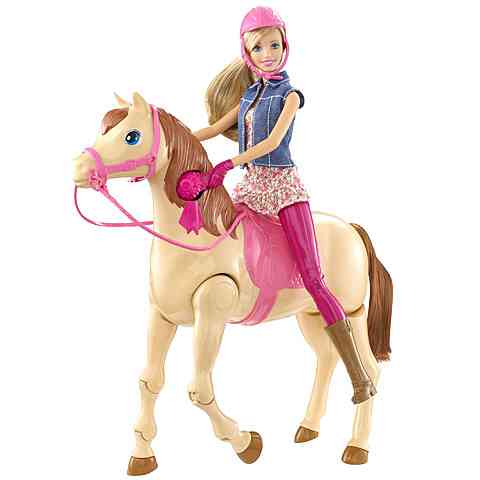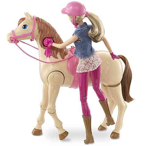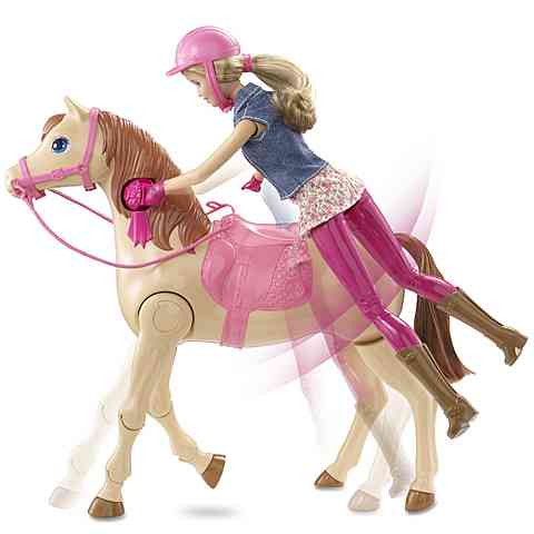 Fantasztikus kikapcsolódásban lesz része Barbie-nak, hiszen kedvenc négylábó barátnjával, Tawny-val tölthet el egy csodás délutánt a szabadban. Tawny, a csodaszép ló lépkedni is képes, míg Barbie-t egyszerűen egy gombnyomással felültetheted a nyeregbe. Csak csatlakoztasd a kezát Tawny nyakához, majd a sörény megnyomásával Barbie már fel is pattan rá. Tedd fel Barbie fejére a sisakot és már kezdődhet is a lovaglás!