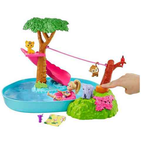 Ez a különleges szett egy jókora medencét tartalmaz, melynek a közepén egy fáról induló csúszda is helyet kapott. A medencében a víz gombnyomásra áramoltatható, így az úszógumira ültetett Chelsea baba körbe-körbe fog úszkálni. A kiegészítők közt megtalálható a 4db cuki kisállat figura is. A Barbie & Chelsea: Az elveszett születésnap az első olyan Barbie film, melyben Chelsea főszerepet kap. A 7 éves lány szüleivel kirándulni megy és amikor átlépik az időzónát, azt hiszi, hogy a születésnapja is elveszett, így barátaival elindul megkeresni azt a dzsungelben és közben természetesen rengeteg kalandba keveredik. A Chelsea baba 15cm magas, kezei és lábai mozgathatóak, feje forgatható.