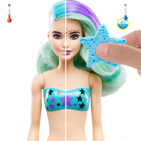 A Barbie Color Reveal különleges élményt nyújt a tulajdonosuk számára, hiszen a babák megjelenése teljes meglepetés, egészen addig, míg a meglepetés kiegészítő csomagokat ki nem bontjuk, valamint amíg a babát nem tesszük vízbe. Most egy sellő baba változatot hoztunk el gyermeked számára, melyet a saját dobozába téve és vízzel feltöltve már meg is láthatjuk milyen az uszonya és fürdőruhája. A sellők színes hajat kaptak, kiegészítői között pedig rengeteg különleges dolgot találhatunk. A sellő arcát meleg vízzel átitatva egyedi arcdíszük is láthatóvá válik, és remek társ lehet a fürdőkádban is akár.