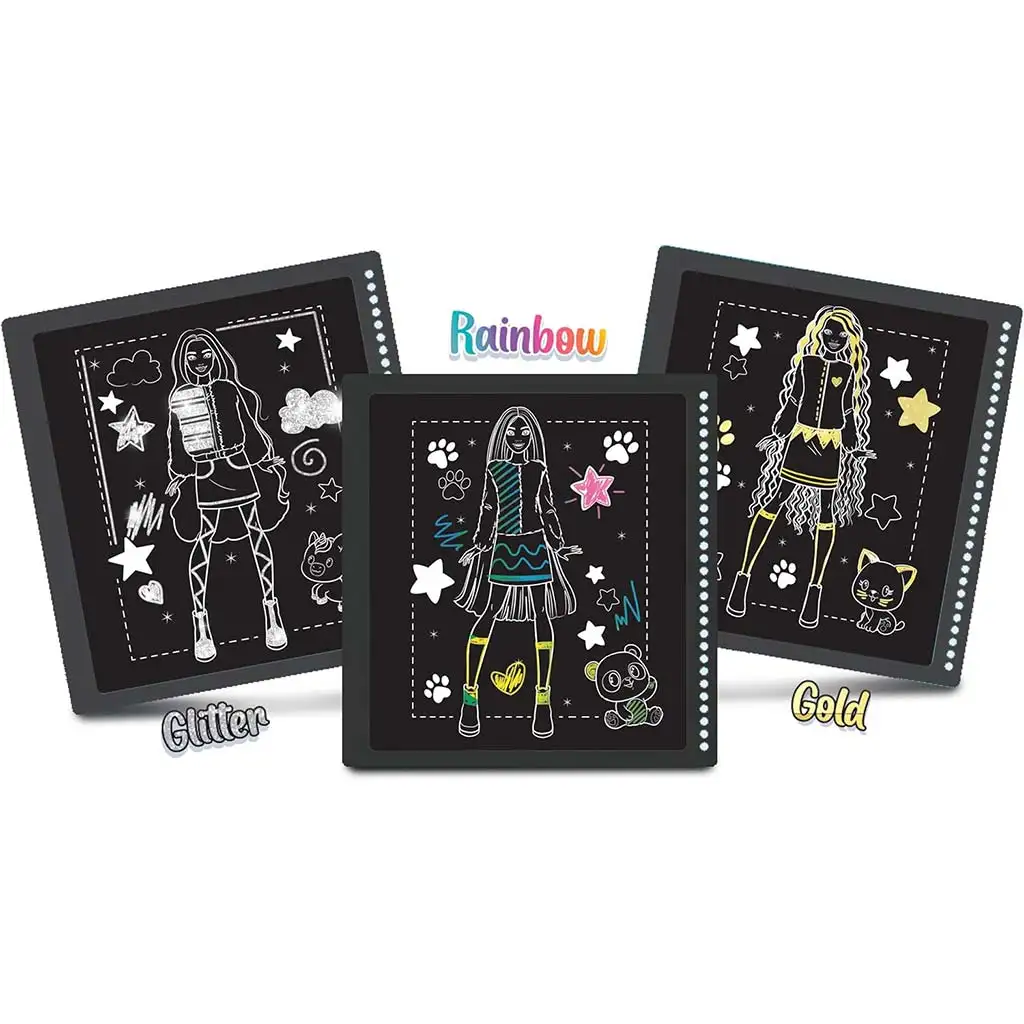 A Barbie Cutie képkarc készítő szett egy szuper kreatív rajzolós élményt kínál a gyerekeknek, akik imádják a csillogó színeket és az aranyos mintákat! Ebben a 44 oldalas spirálfüzetben a gyerekek kaparóceruzával fedhetik fel a rejtett mintákat, amelyek szivárványos, arany és csillámos színekben pompáznak. A különleges lapok között öltöztetős Barbie-figurák, cuki állatkák és különféle divatelemek is megtalálhatók, így a kislányok egyszerre élhetik ki a kreativitásukat és a stílusérzéküket.