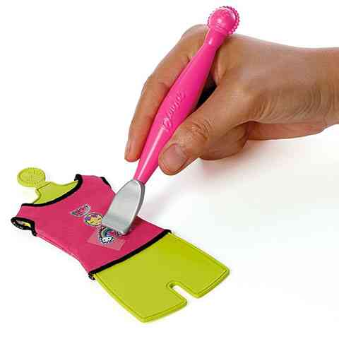 Vicces mintákkal varázsolhatod egyedivé a Kedvenc Barbie babád ruháit ennek a készletnek a segítségével. Csak válassza ki egy ruhát, amire szeretnél mintákat tenni, majd a több mint negyven minta közül kell kiválogatni azokat amelyeket szeretnéd a ruhára vasalni. Húzd fel a ruhát a sablonra, illeszd oda a mintát ahová szeretnéd, majd a kasírozó szerszámmal nyomd rá a ruhára. Végül csak le kell húznod a fóliát a mintáról, ami immár a ruha díszévé vált. A készletben több ruha is található, amelyek mindegyike a te egyedi díszítésedre vár.