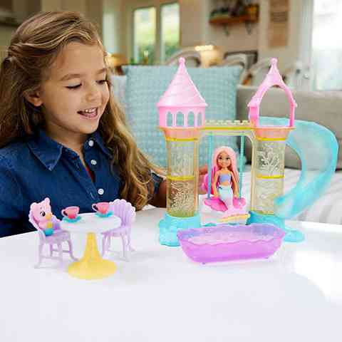 A Barbie Dreamtopia mesefilm igazán különleges helyekre kalauzolta el a gyerekeket, és most itt a nagyszerű lehetőség, hogy a varázslatos látvány kézzelfoghatóvá váljon. A csomagban a kis Chelsea található, de a megszokottól eltérően lábak helyett uszonnyal, akárcsak egy kis hableány. Természetesen a készletben megtalálható Chelsea kedvenc mackója is, illetve egy kastélyszerű játszótér, ahol a kis Chelsea kedvére hintázhat, csúszdázhat és együtt teázhat a mackójával. A játék kiválóan alkalmas arra, hogy a kislányok felidézzék a mese legjobb jeleneteit és inspirálja őket arra, hogy új kalandokat találjanak ki kedvencük számára.