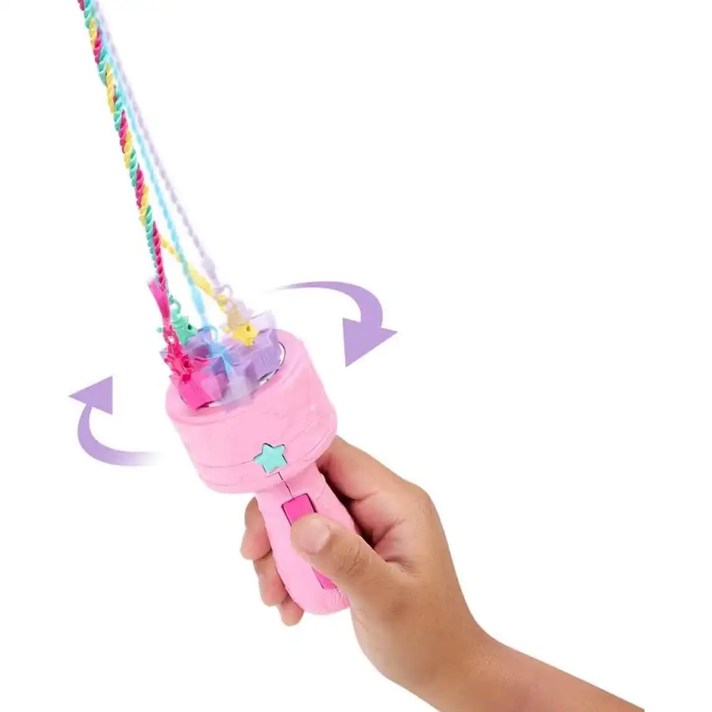 Barbie hosszú, színes haja álomszerűen csillog, és tökéletes alapot biztosít a végtelen frizura-kísérletezéshez. A szett része egy innovatív hajfonó, amellyel pillanatok alatt varázslatos fonatokat lehet készíteni. A fonó használata egyszerű: csak helyezd bele a babahajat, húzd meg a kart, és figyeld, ahogy a haj gyönyörű fonatokká alakul!