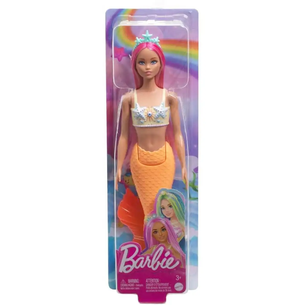 Lépj be a Barbie Dreamtopia varázslatos óceáni birodalmába, ahol ez a csodálatos rózsaszín hajú sellőbaba a mesék legelbűvölőbb lénye! Ez a Barbie baba minden kis álmodozó szívét meghódítja vibráló megjelenésével és fantasztikus részleteivel. A hosszú, élénk rózsaszín haja és a narancssárga uszony csillogó szivárványos tónusokkal ragyog, miközben a baba egyedi, tengeri csillagos fejdísze még különlegesebbé teszi őt.