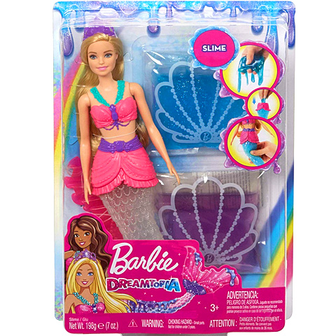Varázslatos kalandok részesei lehetnek ezúttal a víz alatti világban is a Barbie Dreamtopia mesék kedvelői, hiszen ezzel a csodaszép Sellő Barbie babával kezdhetnek játékba. A baba különlegessége, hogy a rugalmas anyagból készült uszonyát csillámló slime ragaccsal tölthetik fel, melyet két színben is megtalálnak a baba mellett a készletben. A kék, valamint rózsaszín slime-ot pillanatok alatt belehelyezhetik az uszonyba, így Barbie máris színesebb lesz!