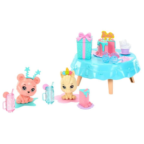 A gyerekek álmaik szülinapi buliját rendezhetik meg ezzel az Első Barbie-m mesebemutatóval! Az Első Barbie-m babákhoz méretarány illeszkedő tökéletes tematikus darabokkal teremti meg a mesélés alapját. Egy imádnivaló medvekölyök és egyszarvú baba szeretetteljes pillanatokra és gondoskodó játékra ösztönzi a gyerekeket. Minden darab a legkisebb kezek számára készült! Az asztalnak különleges felülete van a stabilitás növelése érdekében, a könnyen kezelhető darabok pedig fejleszthetik a kézügyességet. Mindegyikük születésnapi fejpántot visel az alkalom megünneplésére! A készlet babát nem tartalmaz!