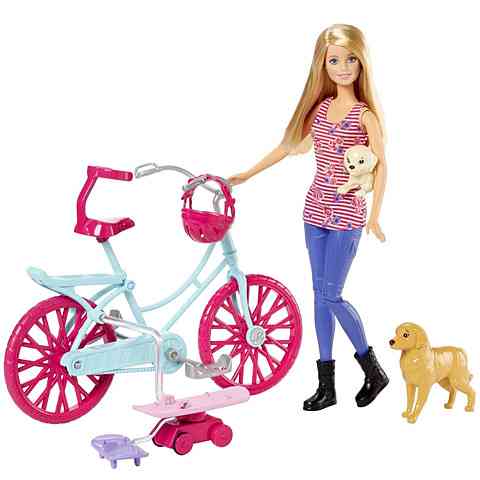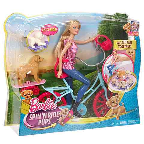 Egy igazán érdekes kirándulásra invitál Barbie, hiszen most nem egyedül indul útnak, hanem magával viszi kis kedvencét Tiffanyt, és egy kölykét is. A kerékpárra ültethető Barbie babának kezeit és lábait is rögzítheted a kormányon illetve a pedálokon, valamint a biciklihez kapcsolhatod a kutyusok számára kialakított gördeszkát. Amint meglököd a kerékpárt, Barbie lábai tekerni kezdik a pedált, a gördeszkán pedig a kis kutyus halad körbe-körbe. A látványos túra remek móka lesz!