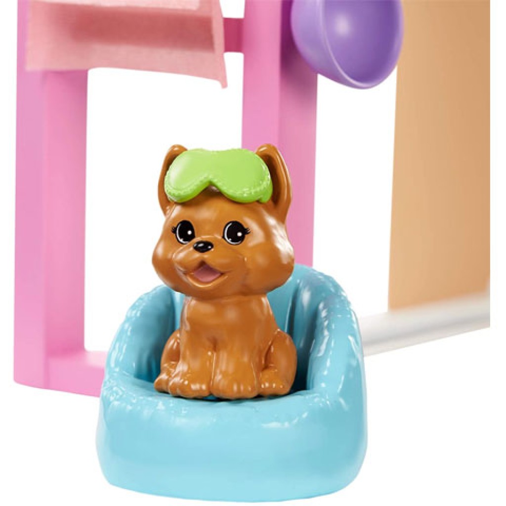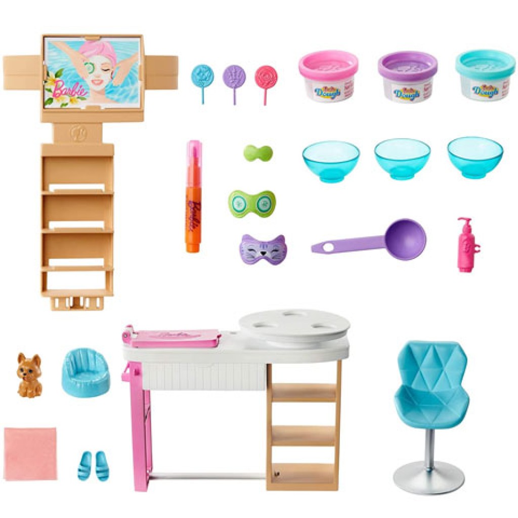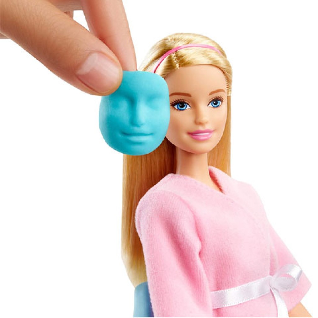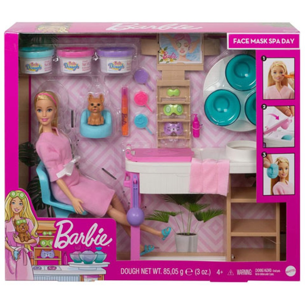 Barbie egy nagyon csajos és mozgalmas világba enged betekintést számunkra, ahol rengeteg foglalkozást és programot ismerhetünk meg. Most Barbie épp szépségszalonba készül, amihez minden megtalálható, amire szüksége lehet ehhez. A szettben Barbie mellett egy kiskutyus is megtalálható, akinek saját szemfedője és ágya van. A szettben egy kozmetikai asztal is megtalálható, amihez törölköző, gyurma fagyi, krémek és egy filctoll is tartozik, melyek mind kellenek majd a kezeléshez. Barbie köntöse tökéletesen illik hozzá, uborkás szemfedője pedig puhává és kipihentté varázsolja Barbie-t.