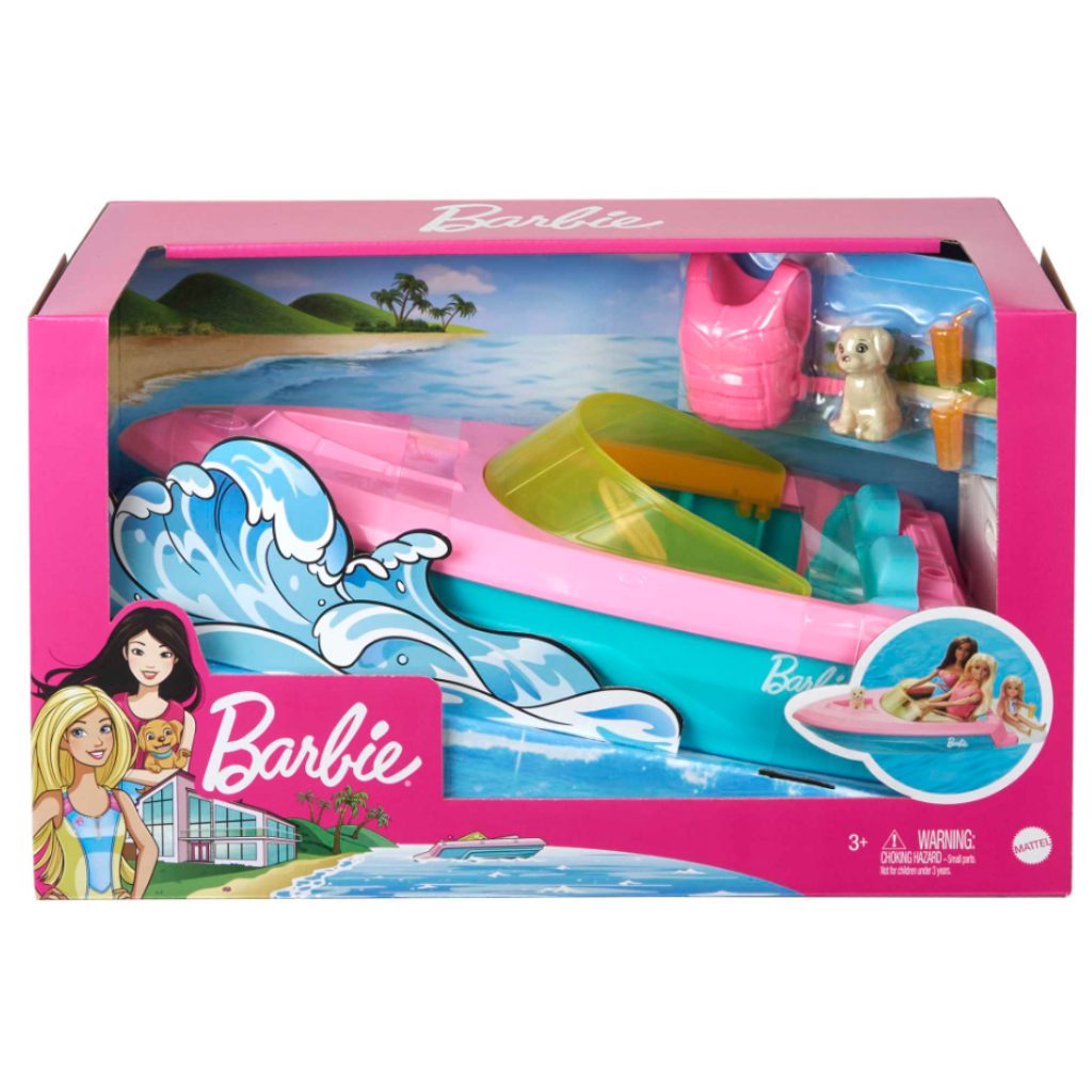 Barbie imádja a napsütést és a tengert. Ezzel a készlettel a képzelet hullámain hajózva végtelen történetek játszhatók el vele, kiskutyájával és a menő, valóban úszó motorcsónakjával. A csónakban 3 (külön kapható) babának is jut hely, így együtt élvezhetik a ringatózást mielőtt kikötnének megpihenni. A szettben egy a babákra illeszkedő rózsaszín mentőmellény is helyet kapott, hogy bátran vághassanak neki a mélyebb tengereknek is. Kikötés után a pohártartóknak és a mókás kiegészítőknek köszönhetően vidám kikötői kalandokban lehet részük. Több babával még több szórakoztató kaland játszható el. A vízben történő játékhoz szülői felügyelet szükséges. 3 éves kortól ajánljuk.