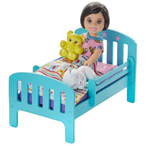 Barbie a divat mellett a kisgyerekekért is rajong, így szívesen vállal felvigyázást a gyerekekre, ami pedig a kislányoknak remek játék lehetőségget kínál. Ebben a csomagban a fáradt kisgyermek baba alig várja, hogy a sötétben ragyogó pizsamában ágyba bújhasson. A cica régóta elaludt, mackója, takarója és mesekönyve még több játéklehetőséget kínál, de a fogmosásról semmiképp sem feledkezzünk meg! A fogkefe és a fogkrém fogantyúval rendelkezik, így a baba a kezében tartja. A baba öltözetét az "Alvó üzemmód" nyomtatású póló, a fehér mintás lila nadrág és a rózsaszín cipő adja, a Skipper baba pedig egy kényelmes pizsamát kapott.