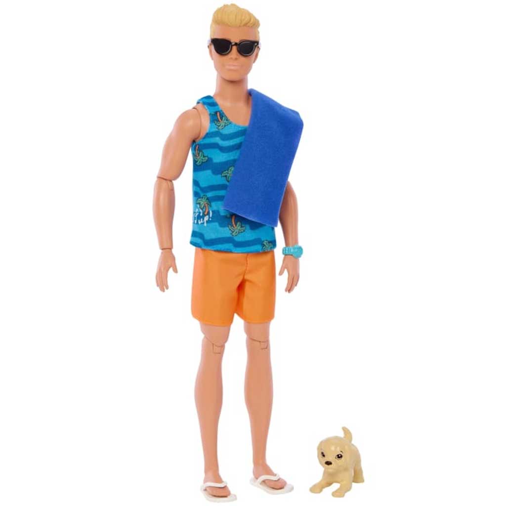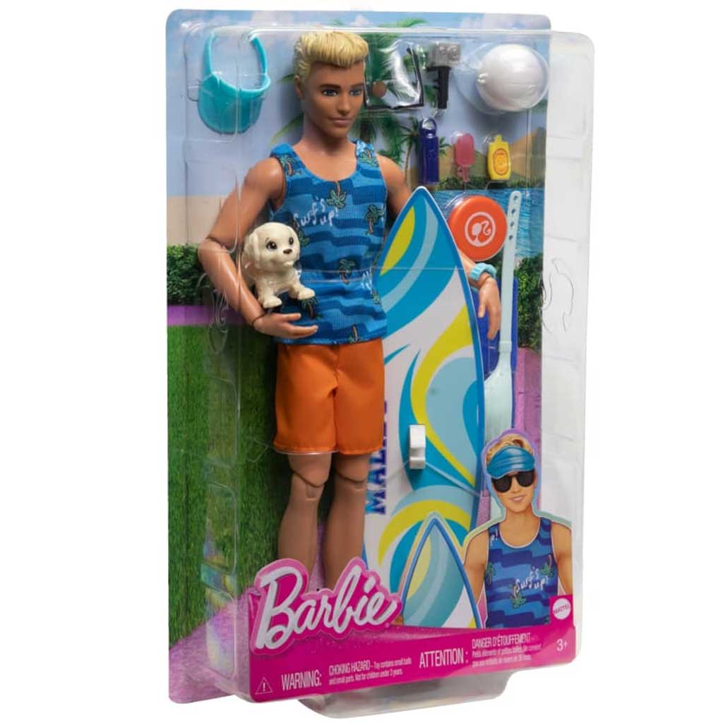 Vigyázz, kész, szörf! Ezzel a Ken® baba segítségével a gyerekek átélhetik a tökéletes tengerparti napot. A baba szörfdeszkával érkezik, amelyen barázdás nyomat található, és lábbilincsekkel rögzíthető a helyére, miközben lovagol a hullámokon. A sportos Ken® baba úszóruhát visel, papucsokkal kombinálva, és hozzá tartozik egy játékos kiskutya is. A baba állítható testtartása valósághű mozgást tesz lehetővé, így élvezheti a napsütéses szórakozást. A kiegészítők között megtalálható az övtáska, törölköző, frizbi, napszemüveg, napellenző, kulacs, fényvédő krém, sportkamera, óra, és labda is.
