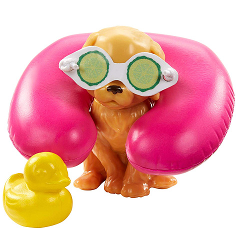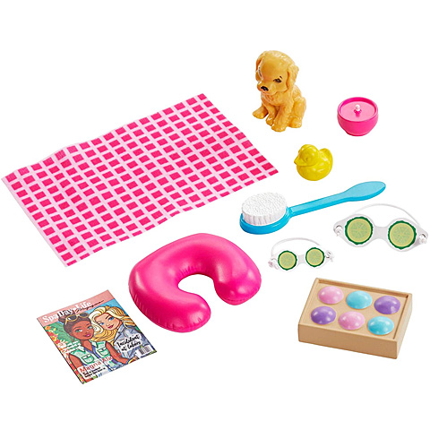 Pihentető kikapcsolódásban lehetnek a kislányok a társai Barbie-nak, aki természetesen a wellness szállóba sem megy egyedül: kiskutyája tart vele, akivel így együtt élvezhetik a kényeztető programokat. A szőke hajú Barbie baba kiegészítőkkel együtt érkezik a dobozban, így akár uborka pakolást is helyezhetnek a szemére vagy épp újságot olvasva lazulhat el a vízben. A baba kialakítása lehetővé teszi a változatos játékot, hiszen végtagjai több ponton is mozgathatóak.