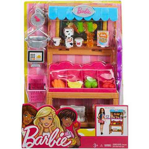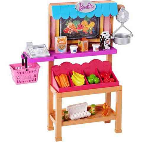 Barbie szereti az egészséges ételeket, ezért nincs olyan nap, hogy ne látogatna el a szupermarketbe. A zöldséges stand láttán kedvenc babád nagyon meg fog örülni, hiszen mindent megtalál, amire csak szüksége lehet. Add a kezébe a trendi, rózsaszín árnyalatú bevásárló kosarat, és már kezdődhet is a shopping. A mérlegre helyezve tudja Barbie ellenőrizni, hogy az összeszedett étel elegendő-e a recepthez, majd ha végzett, a pénztárnál tud fizetni. Szedd össze babáidat és állíts be egyet az eladó pultba, a többiek pedig lehetnek a vásárlók, így téve még izgalmasabbá a játékélményt.