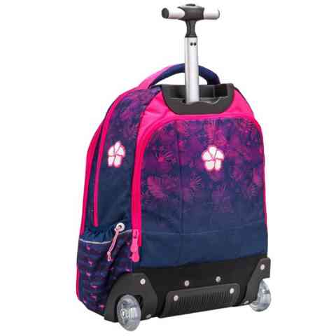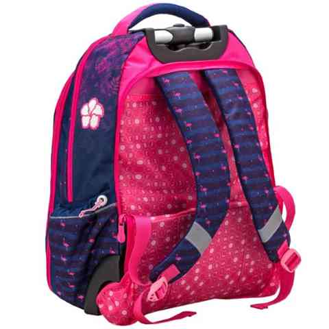 A Flamingo egy igazán csajos és egyben praktikus iskolatáska ami a rózsaszín és lila színeivel, valamint a flamingóval és trópusi virágokkal díszített mintájával egészen biztos, hogy elnyeri a lányok tetszését. A Belmil gurulós iskolatáskái masszív kerekeken gurulnak, és egy állítható alumínium fogantyúval húzhatják a gyerekek, ugyanakkor gyorsan és egyszerűen át lehet alakítani és párnázott, állítható vállpántok segítségével háton is kényelmesen lehet hordani. A táska belő kialakítása is praktikus, hiszen a nagy belső rész több zsebbel van tagolva amelyben akár egy laptop is kényelmesen elfér, az oldalzsebekben pedig a frissítőt tartalmazó kulacsnak van hely. A táska tartósságát a kiváló minőségű anyagok és a műanyag talprész garantálja.