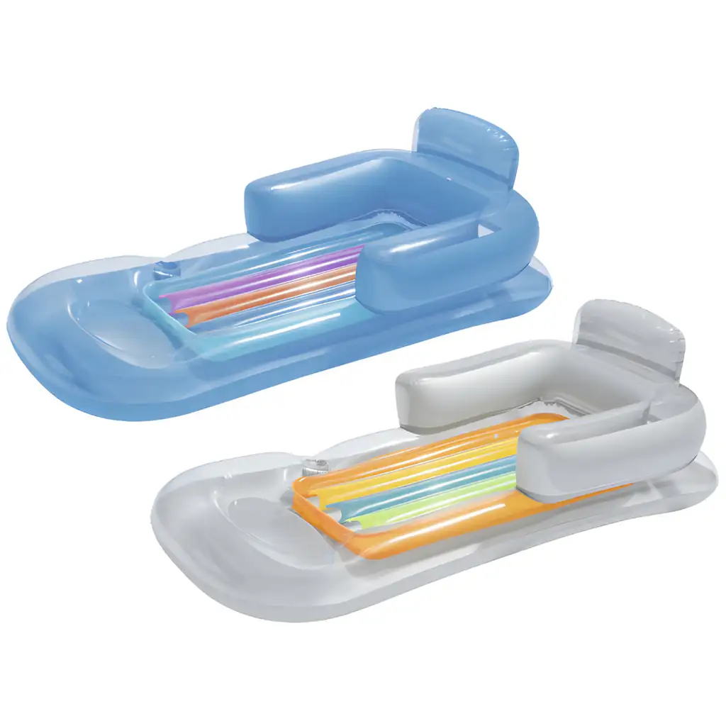 Dőlj hátra és relaxálj a víz felszínén ezzel a kényelmes matraccal, amelynek kar- és háttámlája is van. A támlás gumimatrac átlátszó műanyagból készült, színes díszítéssel, amely stílusos megjelenést kölcsönöz neki.