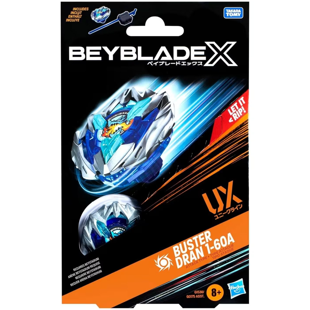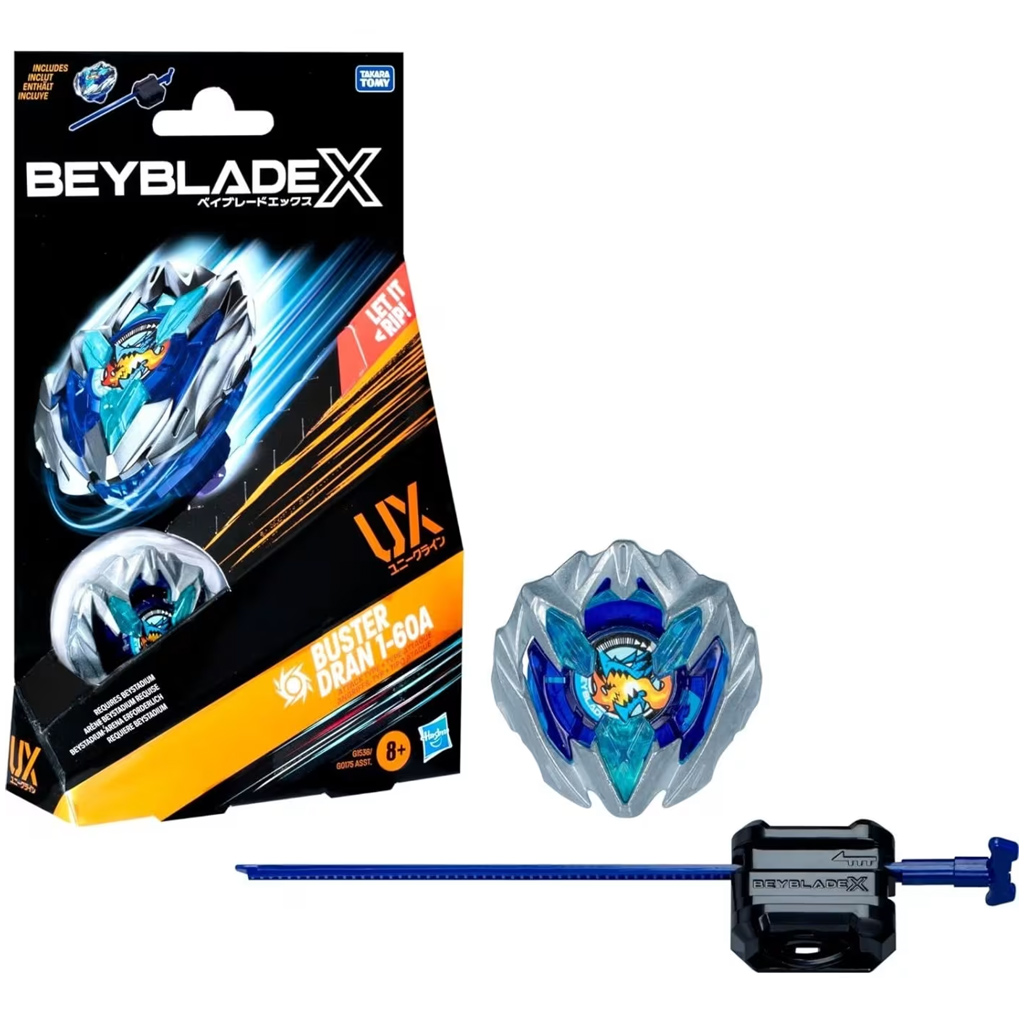A Buster Dran dizájnja erőt sugároz – az ezüstös-kék külső, a villám minták és a karakteres logó igazán vagány megjelenést adnak neki. A szett tartalmazza a kilövőt és a hosszú fogantyús zsinórt is, így már a dobozból kivéve indulhat a küzdelem. A 60A támadó típusú csúcs a sebességre és az ütközési hatásra lett optimalizálva, míg a 1-es fogaskerék stabil alátámasztást ad a heves pörgésekhez.