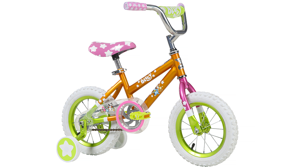Ez a 12 hüvelykes kerékpár élénk kék, zöld és narancssárga színsémával, valamint Bluey-inspirálta grafikákkal rendelkezik. A gyerekek a levehető segédkerekekkel és a könnyen használható hátsó fékekkel tanulhatják meg a kerékpározást.