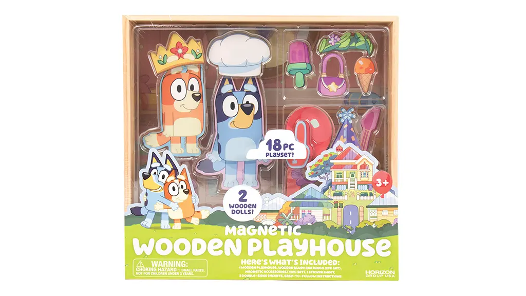 Ez a 18 darabos játékkészlet tartalmaz egy mágneses fából készült Bluey és Bingo figurát, 12 mágneses kiegészítőt, újrapozícionálható matricákat, és egy újrahasználható táblát két kétoldalas játéktérrel.