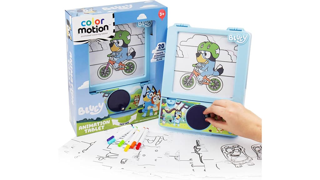 A gyerekek 20 különböző Bluey vagy Hello Kitty jelenetet színezhetnek ki a mellékelt filctollak és sablonok segítségével. Ezután a táblagép forgatható tárcsájával életre kelthetik alkotásaikat, mozgást vihetnek a képekbe. Ez a kreatív játék fejleszti a kézügyességet, ösztönzi a képzelőerőt, és órákon át tartó szórakozást nyújt a gyerekeknek.