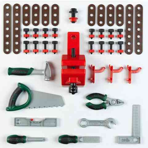 Ez a kis X-lábú szerelőasztal nagyszerűen bírja a terhelést köszönhetően a kiváló minőségű anyagoknak. Az asztalhoz számtalan kiegészítő is tartozik, többek között olyan szerszámok is, mint a kalapács, villáskulcs, reszelő és a fűrész. Az asztalra szerelhető satu pedig nagyszerű barkácsolásra ad lehetőséget. A szerszámok mellett munkaanyagokat is találsz, amelyeket csavarok vagy szögek segítségével tudsz egymáshoz rögzíteni. A munkaasztal alatt és felett kialakított tároló és akasztó rendszer tökéletesen megfelel a szerszámok átlátható tárolására, így mindig rend uralkodik majd a barkácsműhelyedben.