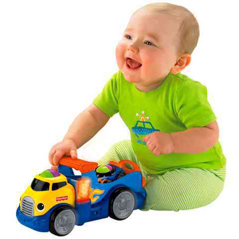 A zene és a fények szórakoztatják a babát ha megnyomja a nagy teherautó kiufogóját.