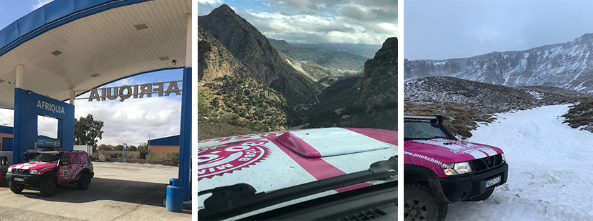 A kontinensre érkezve és Spanyolországot elhagyva teljesen más terepviszonyokkal kellett megküzdeniük, pillanatok alatt 2000 méter fölött autóztak az Atlasz-hegységben. Marokkóban látványos hegyi utak, sziklás és gyors, régi Dakar szakaszok jellemzik az útvonalat. A csapatnak 20-30 cm-es hóban kellett átjutniuk egy-egy részen, amelynek igazán örültek, hiszen akár méteres hóval borított útszakaszok is nehezíthették volna a csapat dolgát. A hegyvidéken autózva kaptunk egy pár fotót a csapattól, amelyeket természetesen veletek is megosztunk. A gyönyörű naplemente és a festői fehérségbe burkolózott téli táj szemet gyönyörködtető látványt nyújt mind a csapat, mind pedig az itthon szurkoló rajongók számára.