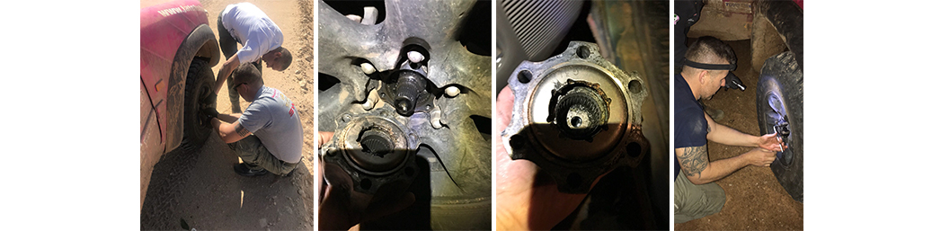 A következő megpróbáltatásra sem kellett sokat várni, hiszen a sivatagba érve a sziklás talaj próbára tette az autó abroncsait és futóműveit egyaránt. Az első kerékagyak nem sokáig bírták ezt a hatalmas terhelést, amit Nagy Zoltán és Heksh Kálmán a csapat két autószerelő tagja sejtett is, ezért sűrűn ellenőrizték azok állapotát. A probléma azonnal feltáródott, hiszen a kerékagyak láthatóan elkezdtek kopni, kétesélyes kérdés az, hogy kibírják-e a verseny végéig..