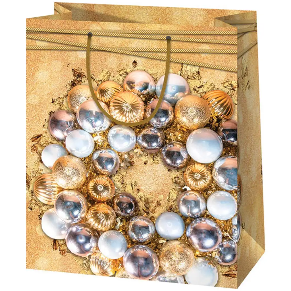 Ez a Cardex arany színű ajándéktáska a karácsonyi elegancia megtestesítője. A táska dizájnját egy csillogó arany, ezüst és gyöngyházfényű karácsonyi gömbökből összeállított koszorú díszíti, amely igazi luxushangulatot sugároz. A tágas, 26x13x33 cm-es méret ideális a nagyobb ajándékok, például ruhák, könyvek, vagy akár kisebb dekorációs tárgyak számára. Az arany háttér és a finom részletek ünnepi csillogást kölcsönöznek a táskának, így az már önmagában is látványos megjelenést biztosít az ajándékodnak. A tartós papírból készült anyag és az arany színű fogantyúk erős és megbízható tartást nyújtanak, hogy az ajándékod biztosan célba érjen. Tökéletes választás azoknak, akik igazán stílusos csomagolást keresnek az ünnepekre.