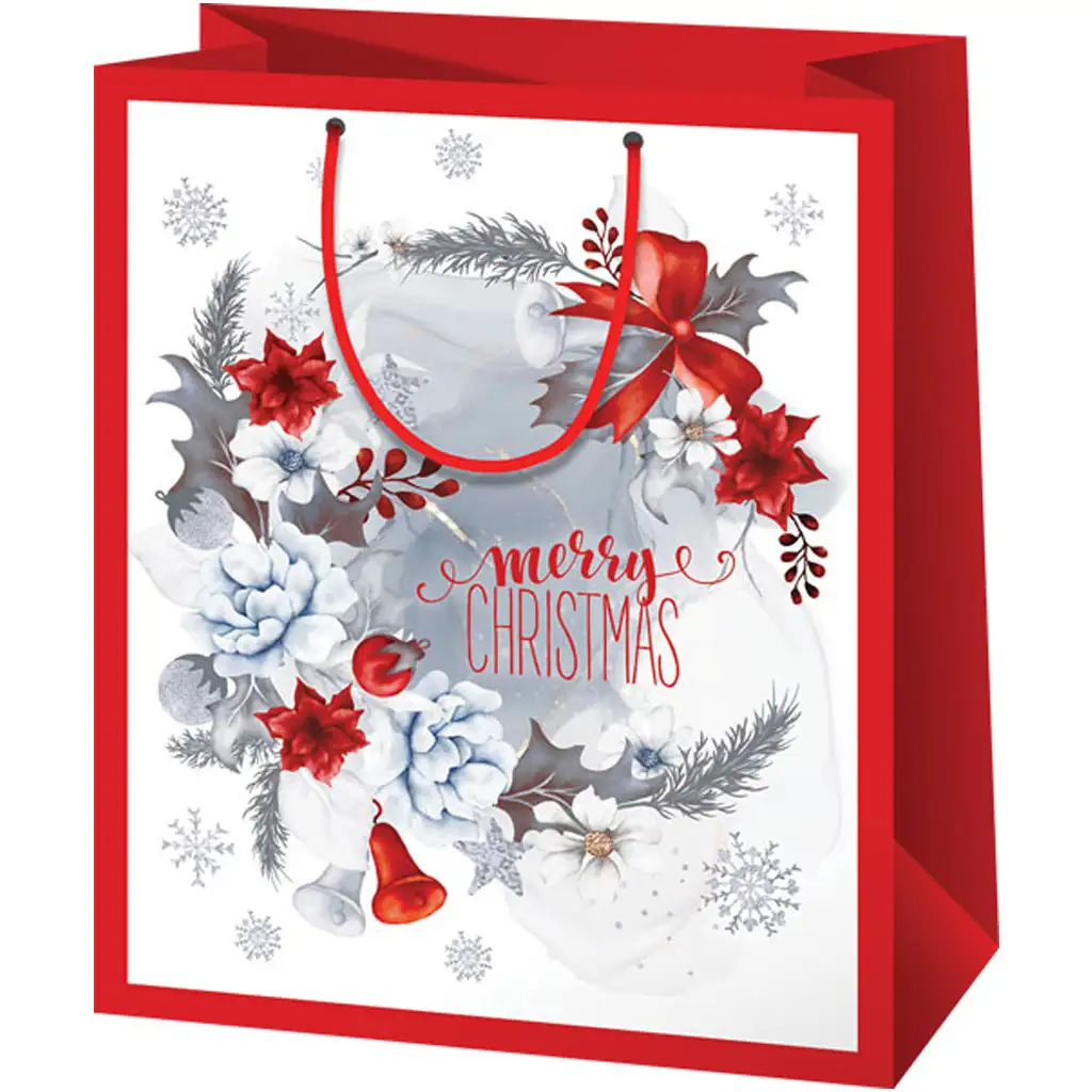 Ez a Cardex piros-fehér ajándéktáska tökéletes kiegészítője a karácsonyi ajándékozásnak! A gyönyörűen kidolgozott, csengettyűkkel, hópelyhekkel és ünnepi virágokkal díszített minta igazi ünnepi varázst kölcsönöz a táskának, miközben a „Merry Christmas” felirat különlegessé teszi a csomagolást. A klasszikus piros-fehér színösszeállítás és a finom grafikai elemek stílusosan emelik ki a táskát, így a megajándékozott már az első pillanatban érezheti az ünnepi hangulatot. A 17x10x23 cm-es méret ideális választás kisebb meglepetésekhez, például kozmetikumokhoz, kiegészítőkhöz vagy finom csokoládékhoz. Az erős anyagból készült fogantyúk kényelmes és biztonságos szállítást tesznek lehetővé, így biztos lehetsz benne, hogy ajándékod elegáns és igényes formában ér célba.