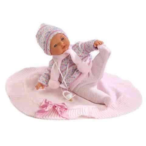 Ennek a kislány babának nem csak ruhája csodás, hanem takarója is, melynek sajátossága, hogy szatén szalaggal van díszítve. A baba pulcsija és sapkája mókás, apró virágokkal van díszítve, ami vidámmá, babássá teszi az összhatást. A ruházatot könnyen le lehet venni a babáról, így az tisztíthatóvá válik. A baba feje és végtagjai gyermekbarát, puha műanyagból vannak, teste pedig textilből. A baba tartozéka az cumi, melyet, amikor a baba szájába helyezünk, az abba hagyja a sírást.