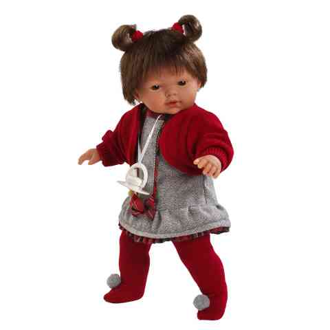 A baba különlegessége nem csak abban rejlik, hogy arca kimondottan karakteres, hanem igényes szín- és formavilágú ruhájában is. A kardigán mély bordó színe vissza köszön nem csak a hajgumiban, hanem a baba pom-pomos harisnyáján is. A ruha szélének kockás mintázata, a díszként a ruha elején lévő masni mintázatát a ruha ugyan ilyen fodra zárja le. A baba teste textil, ebben van elrejtve a sírásért felelős szerkezet, mely a cumival szüntethető meg. Komoly kivitelezése miatt ez az a játék, mellyel minden kislány szívesen játszana.