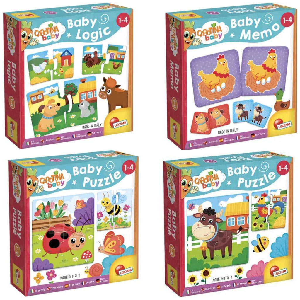 A Carotina Baby játékszettek a legkisebbek számára készültek, hogy játékosan ismerkedjenek meg a logikai készségekkel, a memóriával és a finommotoros készségekkel. Ezek a játékok nemcsak szórakoztatnak, hanem segítik a fejlődést is. A "Baby Logic" szettben a kicsik logikai kapcsolatokat fedezhetnek fel az állatok és környezetük között, míg a "Baby Memo" memóriajátékkal erősíthetik a memóriájukat kedves állatfigurák segítségével. A puzzle szettek élénk színekkel és aranyos karakterekkel díszítettek, így a kicsik örömmel próbálkoznak a képek összeállításával. Ezek a játékok kifejezetten a 1-4 éves korosztálynak készültek, és egyszerű, de élvezetes kihívásokat nyújtanak a fejlődésükhöz.