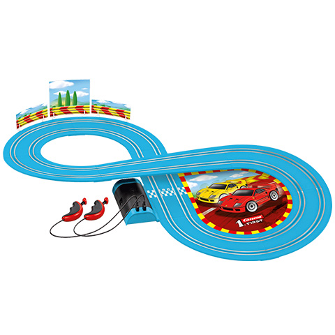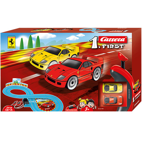 A Ferrari évtizedek óta meghatározó gyárként van jelen az összes autósportban, és most a legkisebbek is belekóstolhatnak a versenyzés örömébe. A Carrera First versenypályán két Ferrari F4 sportkocsival mérhetik össze a gyerekek az ügyességüket. Ez a remek szett egy teljes értékű Carrera autópálya, mely ezúttal nem hálózatról, hanem telepekről üzemel. Az 4db C-s elem hosszú időn át tartó szórakozást garantál a 8-as alakú pályán, melyen az út szakaszok egy felüljáróval keresztezik egymást. A részletgazdagon kidolgozott kisautók tökéletes másai az eredeti Ferrari F40 kisautóknak, így valóban olyan, mintha egy izgalmas verseny zajlana a szoba padlóján.