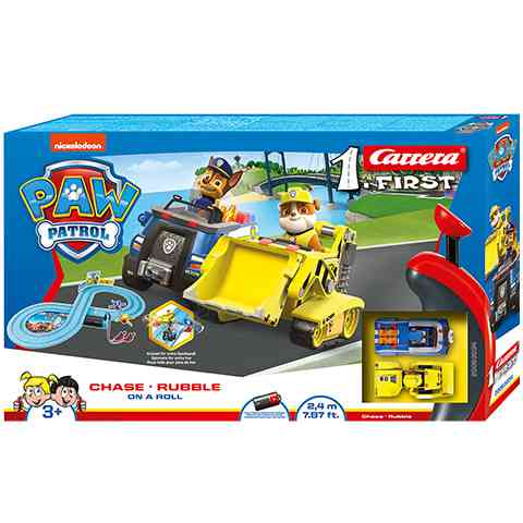 A Mancs őrjárat két legnépszerűbb kutyusa Chase és Rubble áll rajthoz, természetesen az előbbi egy rendőrségi, míg a másik egy munkagép kocsi volánja mögött, azonban csak a gyerekek ügyességén múlik, hogy melyik járgány éri el elsőként a célvonalat. Ez a remek szett egy teljes értékű Carrera autópálya, mely ezúttal nem hálózatról, hanem telepekről üzemel. Az 4db C-s elem hosszú időn át tartó szórakozást garantál a 8-as alakú pályán, melyen az út szakaszok egy felüljáróval keresztezik egymást. A részletgazdagon kidolgozott kisautók tökéletes másai a Mancs őrjárat mesefilmben látott kisautóknak, így valóban olyan, mintha egy izgalmas verseny zajlana a szoba padlóján.