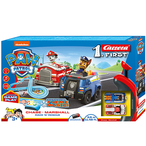 Ezen a versenypályán a két versenyautó végre szemtől szemben összemérheti az erejét, amit ráadásul a gyerekek kedvenc mesefigurái vezetnek. A Mancs őrjárat két legnépszerűbb kutyusa Chase és Marshall áll rajthoz, természetesen az előbbi egy rendőrségi, míg a másik egy tűzoltósági kocsi volánja mögött. Ez a remek szett egy teljes értékű Carrera autópálya, mely ezúttal nem hálózatról, hanem telepekről üzemel. Az 4db C-s elem hosszú időn át tartó szórakozást garantál a 8-as alakú pályán, melyen az út szakaszok egy felüljáróval keresztezik egymást. A részletgazdagon kidolgozott kisautók tökéletes másai a mancs őrjárat mesefilmben látott kisautóknak, így valóban olyan, mintha egy izgalmas verseny zajlana a szoba padlóján.