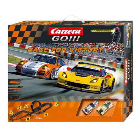 Két legendás versenyautóval csaphattok össze a carrera Race For Victory versenypályán. Az amerikai álom megtestesítője, a Chevrolett Corvette, valamint az európai legenda, a Porsche GT3 száll szembe egymással ezen a nem mindennapi versenypályán. A pályán hurkot, döntött kanyarokat, kereszteződést és még számos izgalmas elemet találtok, melyeknek köszönhetően hosszú távú szórakozásnak néztek elébe, ha ezt a szettet választjátok.