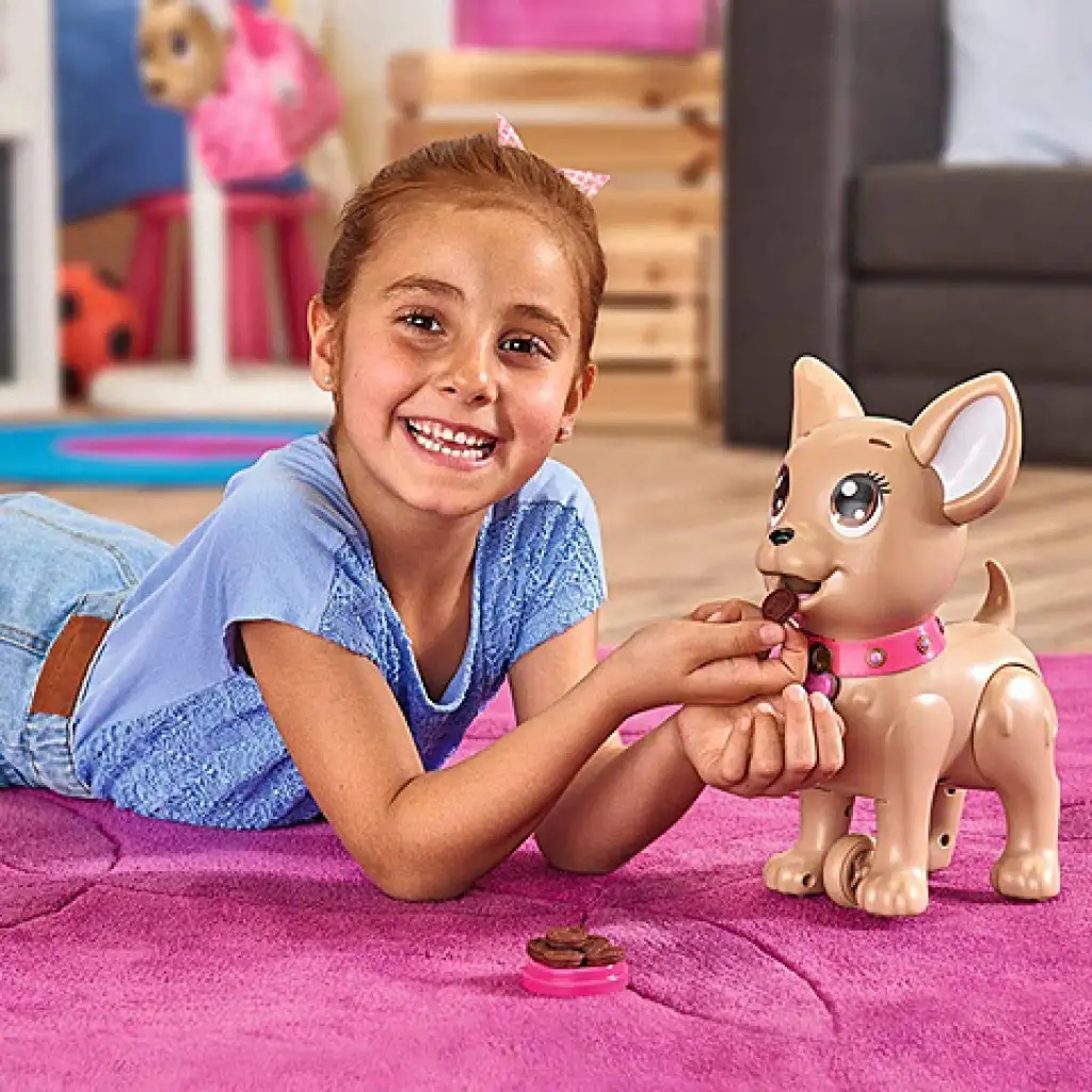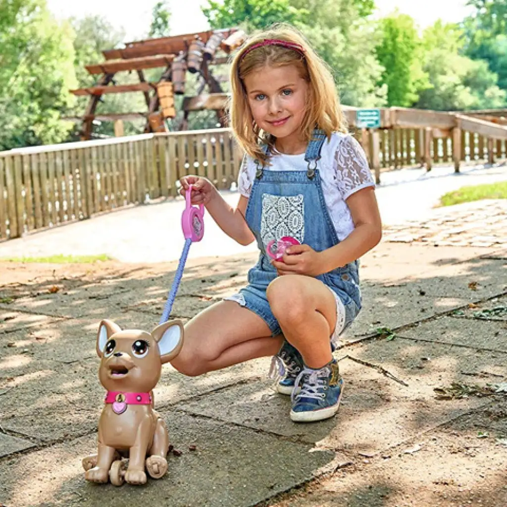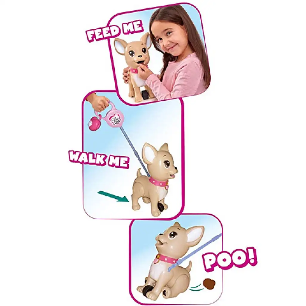 Igazi kis játszótársuk lesz a gyerekeknek ez a bájos ChiChi Love kiskutya, mely nem csak bájos külsejével ösztönzi játékra azonnal a gyerekeket! A kiegészítők között megtalálható a gyurma és a kutyakeksz-készítő forma, melyet meg is etethetnek a kutyával. A pórázt csatlakoztatva máris sétálni indulhatnak vele, azonban a kutyus sétálás közben kakilhat is! Szerencsére a pórázban tárolható erre a célra zacskó, így azt azonnal összegyűjthetik a gondos gazdik.