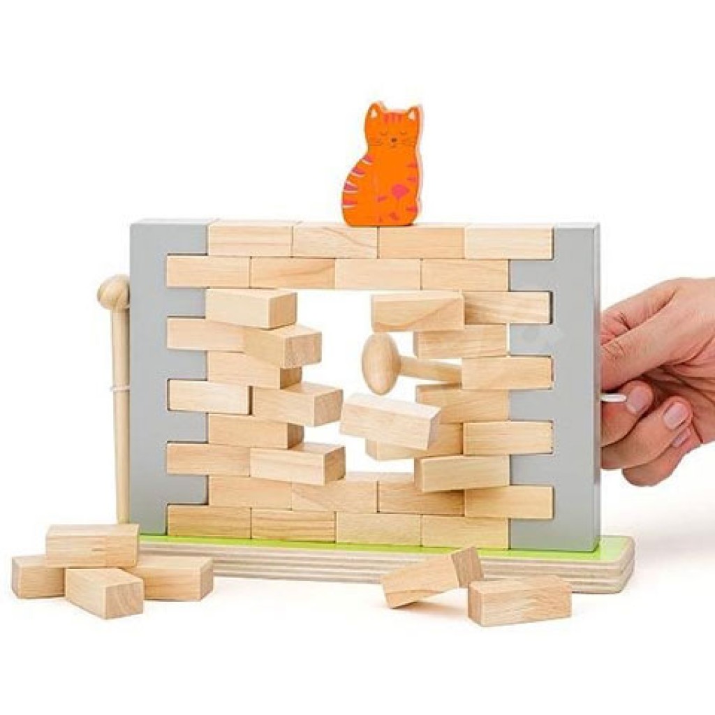 A Cica a falon egyensúlyozós játék nagyban hozzájárul gyermeked készségeinek fejlőséséhez, hiszen a játék menete alatt a kézügyességre, a mozgás koordinációs készségre és a logikára is nagy szükség lesz. Az izgalmas játék során a cica alól kell kiütögetni úgy a fából készült tégla darabokat, hogy a cica a lehető legtovább a tetején maradjon. A játék végén az veszít, akinél a cica leesik az építmény tetejéről.