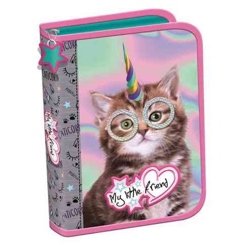 A cicák nagyon aranyosak, de most még aranyasabbá tették, egy unikornis szarvval, valamint egy nagyon csillogó szemüveggel, így elsőre elvarázsolja majd kislányodat. Ha a cica nem lenne elég aranyos, a hologramos borítás biztosan elnyeri a tetszését,belül pedig a tolltartó egésze pink színt kapott, melyen felhőcskék láthatóak, ez szintén nagyon csajos. Belül gumiszalagokkal lehet rögzíteni az írószereket, és biztosan mindennek megtaláljuk a tökéletes helyet majd, ráadásul még egy-egy átlátszó zseb is van rajta, amiben órarendet és szorzótáblát is talál majd gyermeked. Cipzáras zsebét könnyen lehet használni, nem okoz problémát a legkisebbeknek sem.