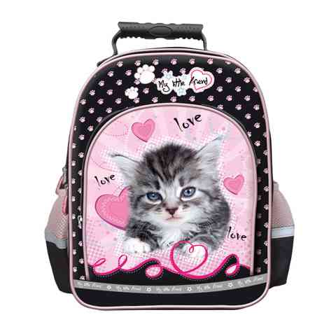 Ennek a cicás mintázatú hátizsáknak nem csak külleme, hanem minősége is páratlan. Kiváló anyagokból készült, hogy tartós legyen a szélsőséges mechanikai hatások ellenére. Vállpánja párnázott, szükség szerint méretre állítható. Hátrészének kiképzése a gyermeket a helyes testtartásra ösztönzi. Ez a hátizsák teljesen figyelembe veszi a gyermekek speciális igényeit. Ezen felül a táskán számos helyen fényvisszaverő elemek vannak, aminek nagy szerepe van a láthatóság, a biztonság szempontjából. A táska két fő rekeszre van osztva, és három külső zsebre, melyek közül az oldalsó zsebek alkalmasak az iskolai kulacs tárolására.